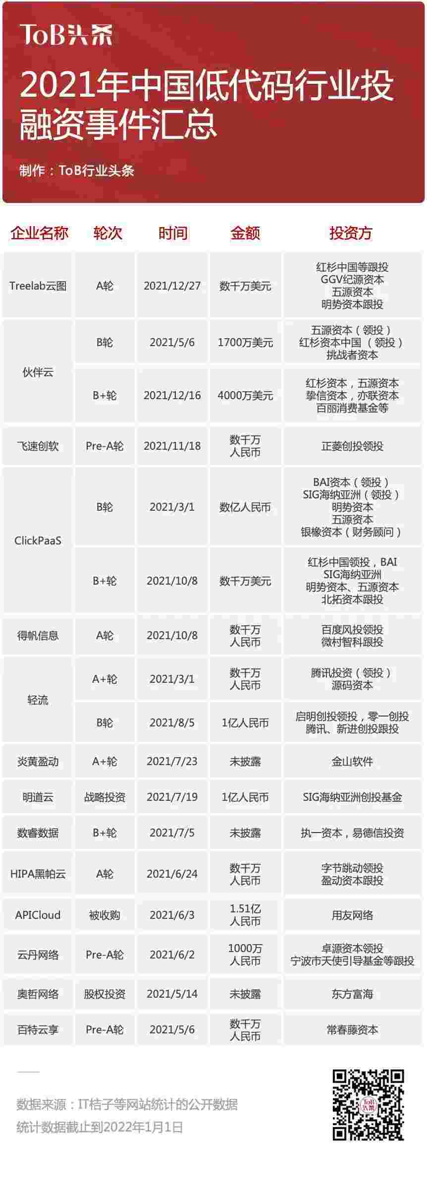 到2021年,,,无/低代码投融资规模势头更甚,,,其中包括轻流两轮融资(A+轮数千万人民币,,,B轮近亿人民币)、、、、美团钱包商家版 两轮融资(B轮数亿人民币,,,B+轮数千万美元)、、、、百特云享数千万元Pre-A轮融资......